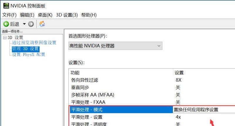 5、平滑处理模式我们选择置换任何应用程序设置,同时平滑处理我们可以选择4X,如下图所示