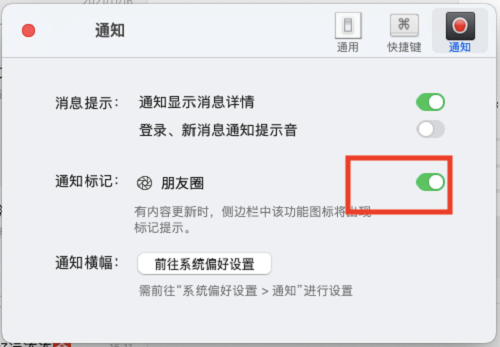 第三步:在通知设置页面,开启【朋友圈】通知标记即可。