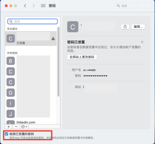 第三步:在密码设置页面,开启【检测已泄露的密码】设置即可。