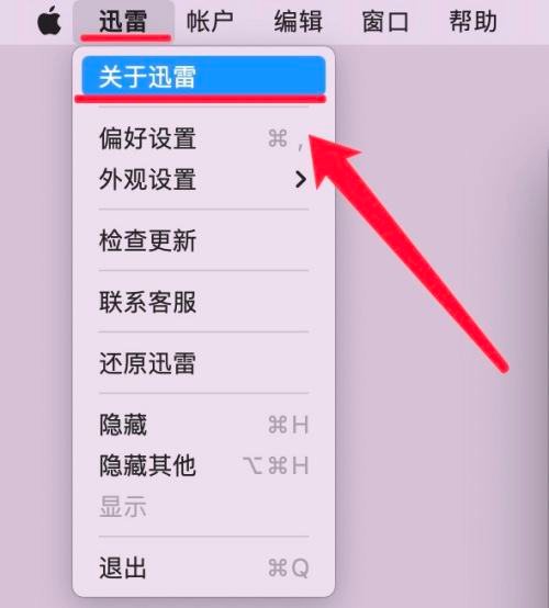 第二步:点击上方菜单中【迅雷】在出来的菜单中,再点击【关于迅雷】。
