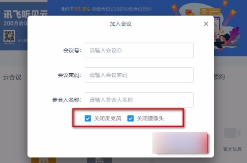 如果不希望会议中其他人听到您的声音或看到您的视频,可以勾选“关闭麦克风”和“关闭摄像头”选项。