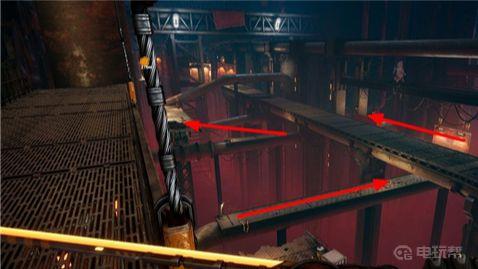 5、前方的平台降下后向右走,使用钩索到达墙壁后向前奔跑。