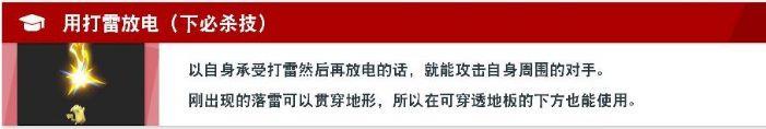 4、下必杀技是打雷,具有陨石效果。将对手向上投掷之后可以形成强力的连段。此外,使用这个技能之后让皮卡丘自身承受再进行放电,就能够攻击自身周围的对手。刚出现的落雷可以从贯穿地形,所以可以在可穿透的地板下方使用这个技能。