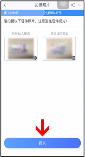 人脸验证完成后,点击“立即拍照”进行证件拍摄。点击“提交”,等待审核。
