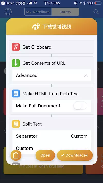 5、在小组件列表中点击Workflow的「下载微博视频」,