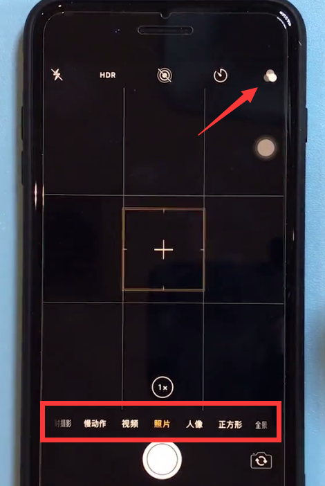 2、在底栏选择需要拍照的类型,我们还可以点击右上角的图标来添加滤镜,