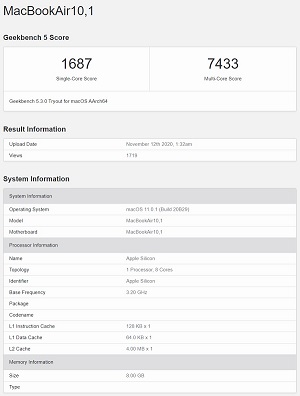 1、Geekbench 跑分显示,搭载 M1 芯片、配备 8GB RAM 的 MacBook Air 单核得分为 1687,多核得分为 7433。M1 芯片的基本频率则为 3.2GHz。与现有设备相比,MacBook Air 的 M1 芯片性能优于所有 iOS 设备;