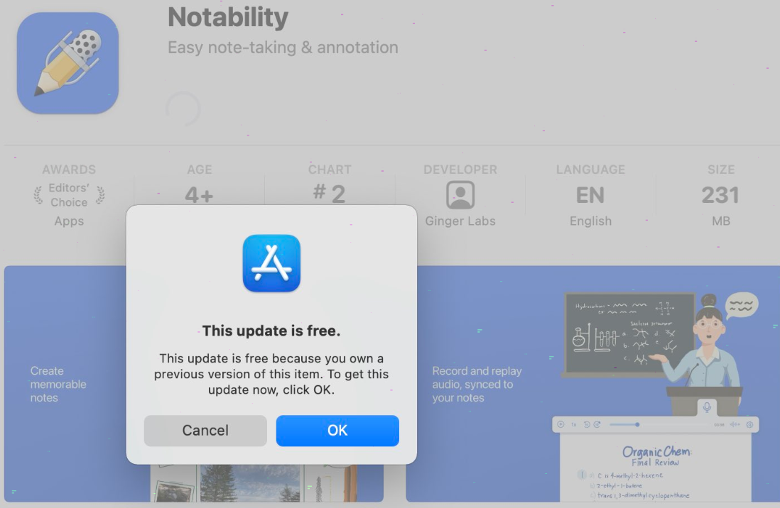 4、重复步骤3,直到系统检测到你之前购买了notability的ipad版,会弹出应用免费提示框,点击ok,即可免费下载