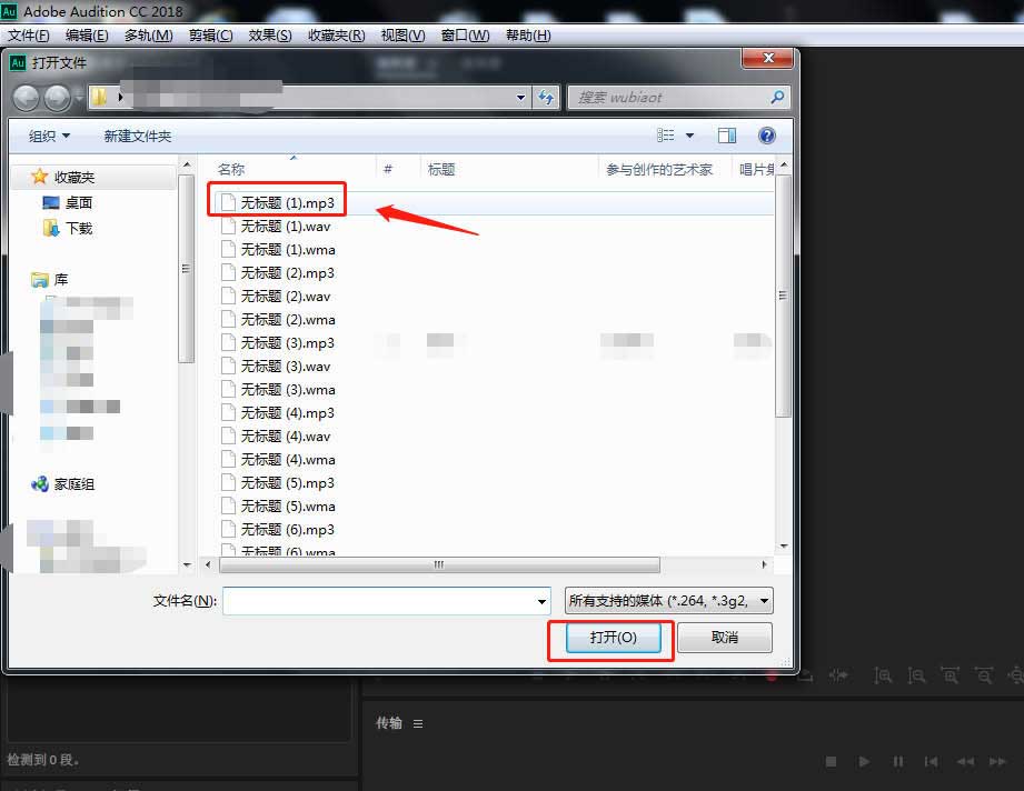 2、在弹出的导入文件窗口中,选择需要的音频素材,点击打开。