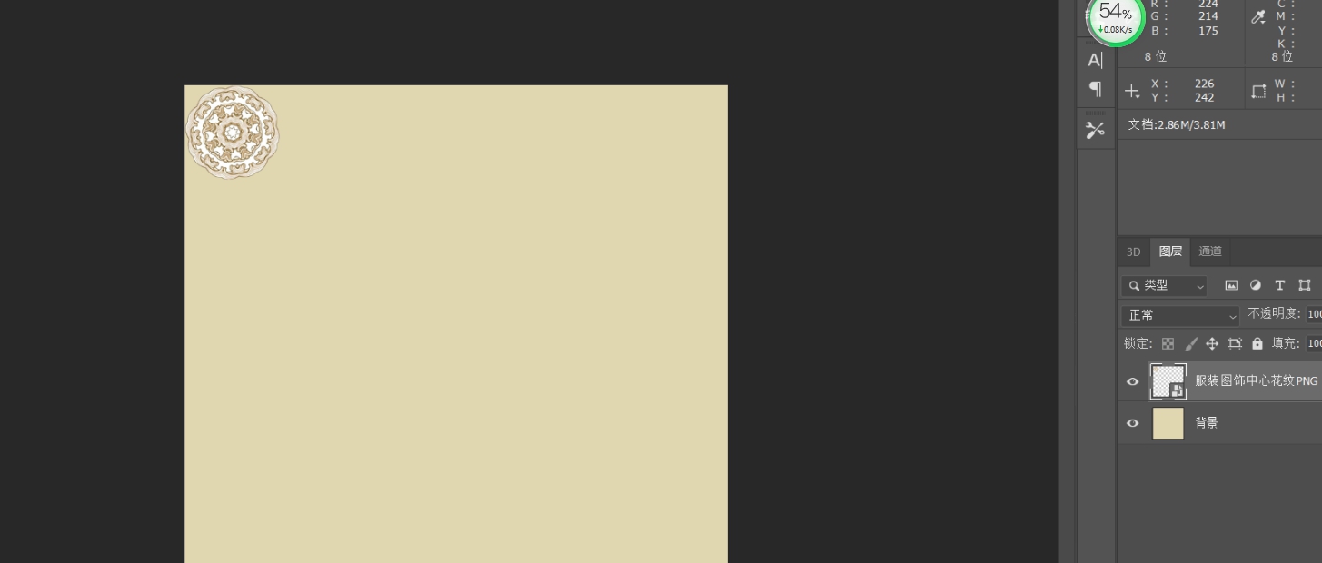 4.通过鼠标来控制图片的锚点来调整花纹的大小,并将图片移动至画布左上角调整过程,可以使用鼠标左键或者肩旁上面的上下左右小箭头。