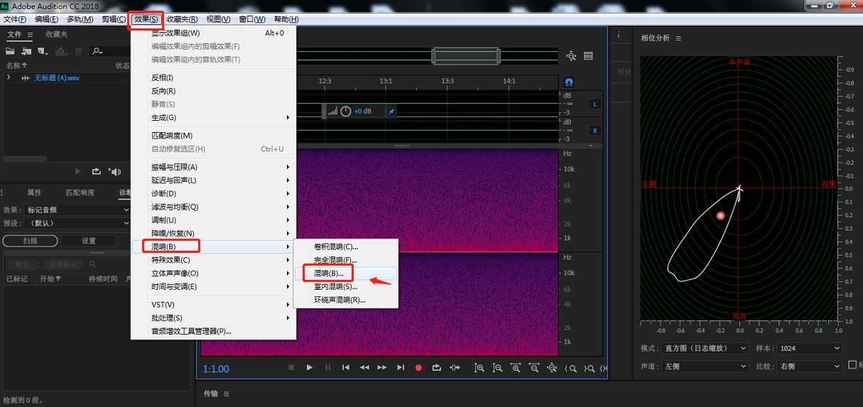 4、点击顶部工具栏中的“效果”——“混响”——“混响”。