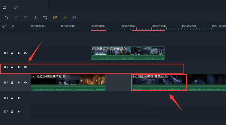 4.鼠标点击选中轨道1中的后半段视频,将视频拖到插入的新轨道中即可