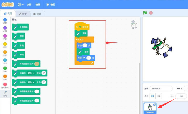 scratch怎么用雪人画圆