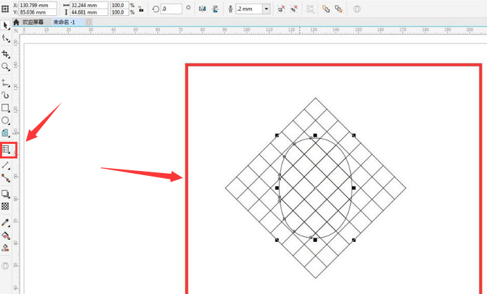 2.点击表格工具绘制表格后,将其旋转45度,按下Ctrl+q键转曲,使两个图形重合相交