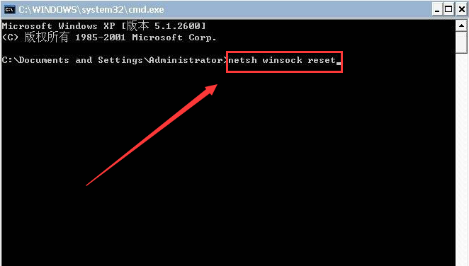 2.在打开的命令符窗口中输入netsh winsock reset并按下回车键