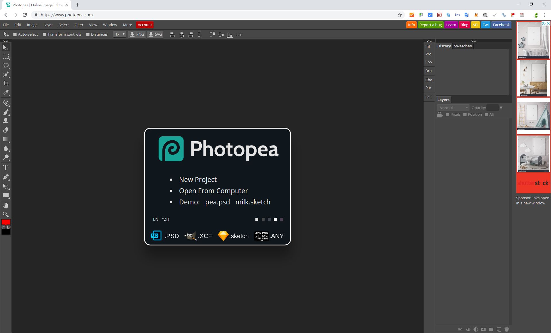 Photopea 是一款非常强大的在线图片编辑工具。 它与PS非常相似。 拥有画笔工具、钢笔工具、快选工具等PS拥有的多种专业图片编辑工具,操作方法也与PS类似。 此外,Photopea还有一个图片素材库,我们可以随时在里面找到自己想要的素材,直接添加到图片中使用。