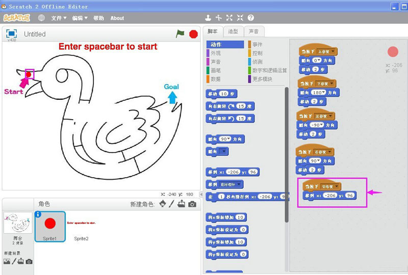 点事件,将“当按下空格键”拖到右边的编辑区,并改为当按下上移键;