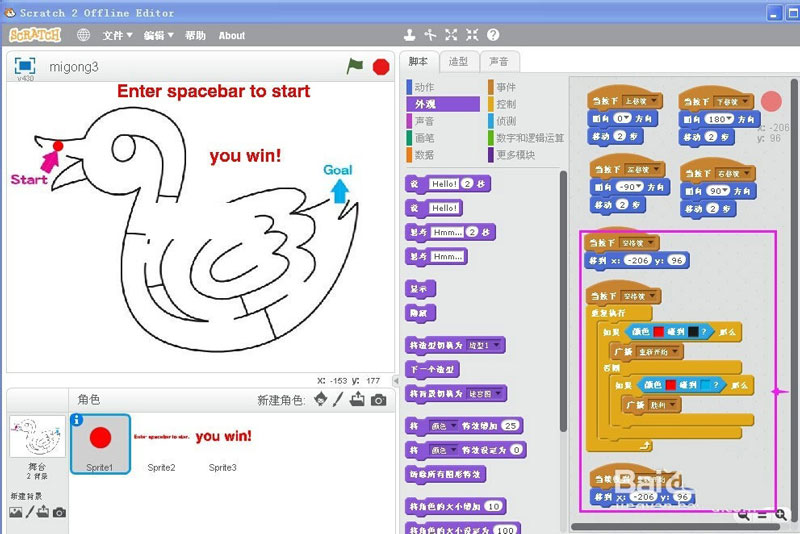 当按下空格键,小球来到迷宫的起点为,按上、下、左、右光标控制键,小球开始在人的指挥下运动,遇到迷宫壁黑色就跳回起点,遇到迷宫终点的蓝色就显示you win!