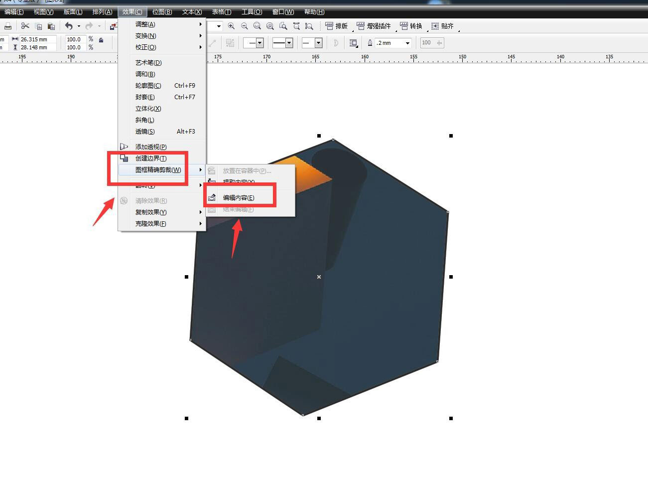接着点击效果菜单栏,选择图框精确剪裁——防止容器中。