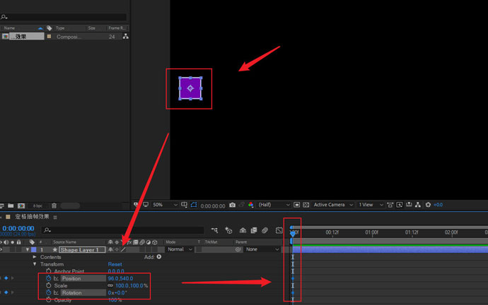 1.点击形状工具,在合成窗口画一个100*100大小的矩形