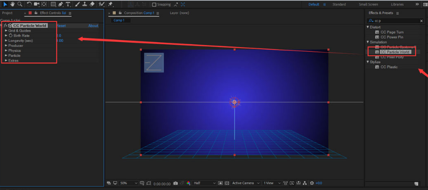 2.按下键盘的Ctrl+Y键新建固态层,重命名粒子层后,添加CC Particle World粒子特效