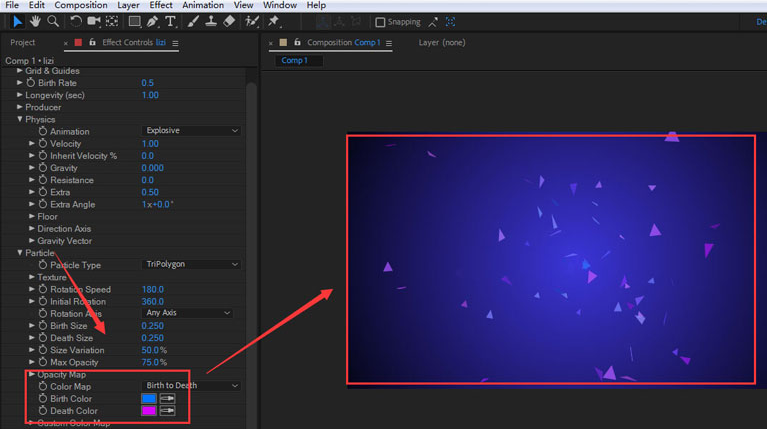 3.如下图所示步骤,将粒子参数的类型修改为三角形TriPolygon效果