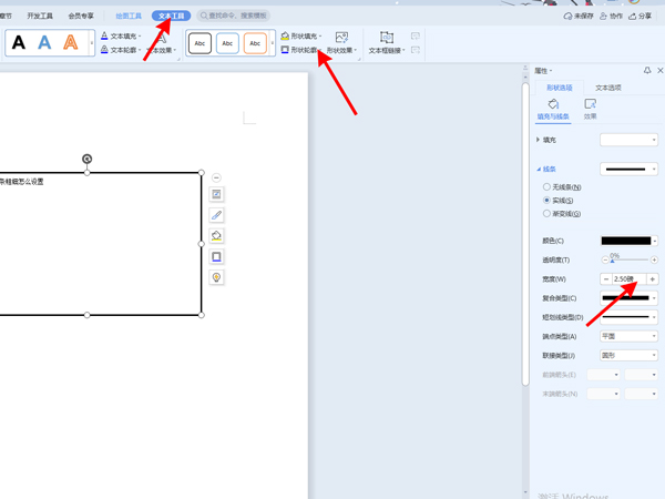 2、点击文本工具,点击形状轮廓,选择实线,点击宽度设置线条粗细。