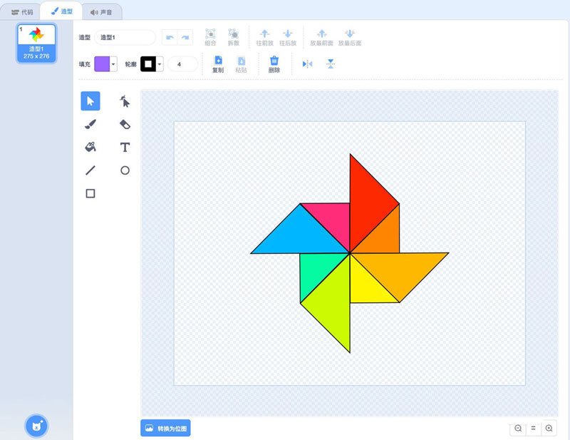 打开Scratch软件,新建三个角色,分别为风车杆、风车扇叶、固定钉子,如图