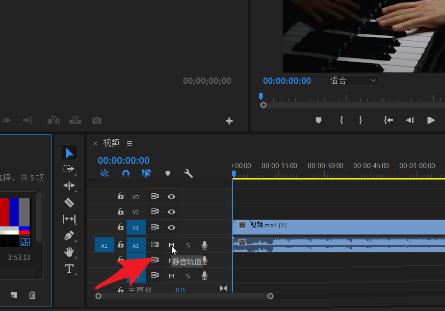 然后点击音轨,选定视频上的音轨,再点击箭头所指的静音轨道按钮。
