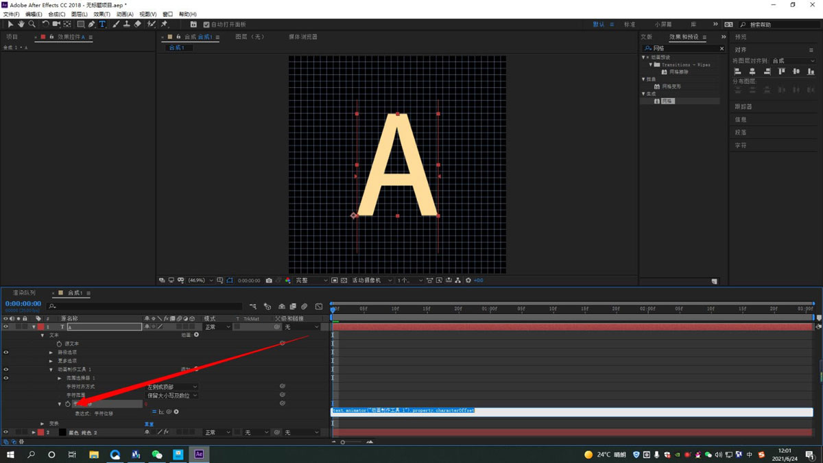 3.接着按住alt点击“字符位移”前的码表,展开表达式