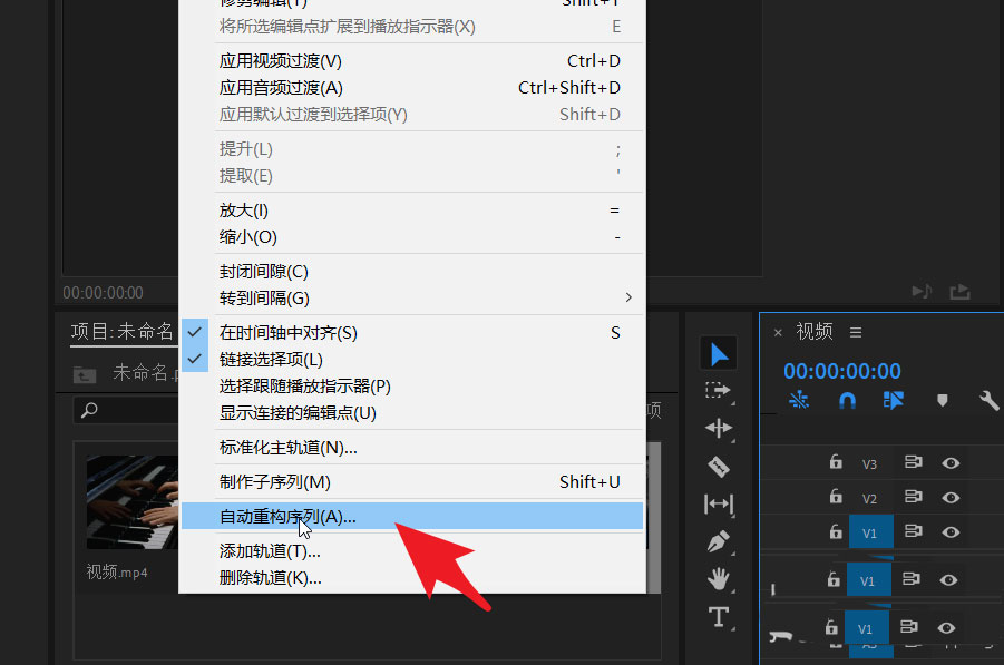 然后在序列菜单的下拉菜单中选择自动重构序列。