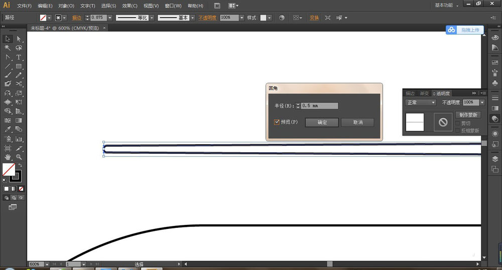 选择矩形工具,绘制一长方形,并选择自由变换工具将其中一端放里缩绘制筷子形状。并将缩小的一端描点选中,执行效果-风格化-圆角,设置圆角半径为0.5mm.