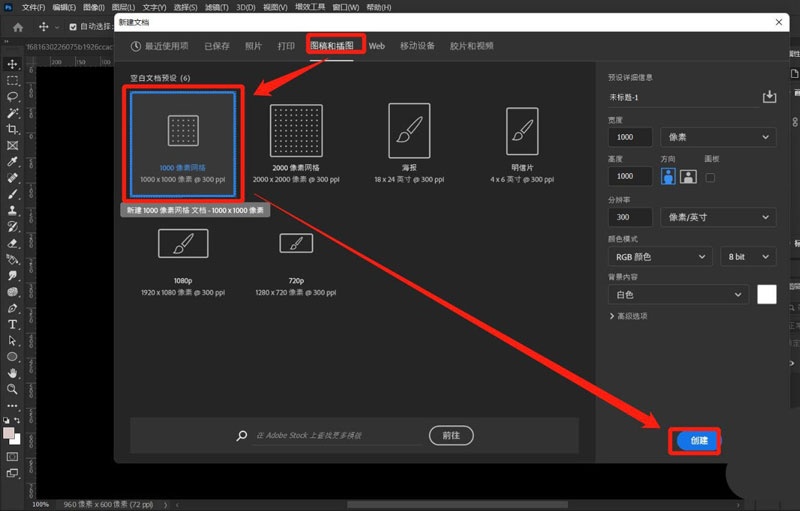 接着在打开的新建文档选项卡点击“图稿和插图”选项后选择“1000像素网格”选项即可;