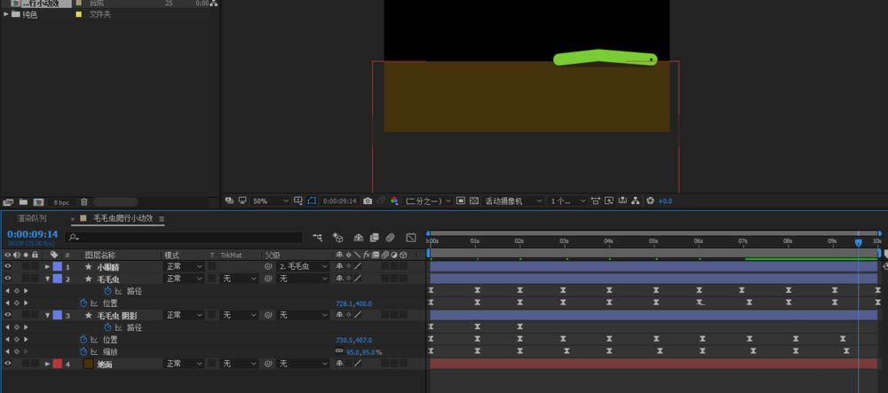 给毛毛虫的位置和路径K关键帧,完成一个身体爬行前进的效果。路径用钢笔工具去调整一个弯曲的效果。