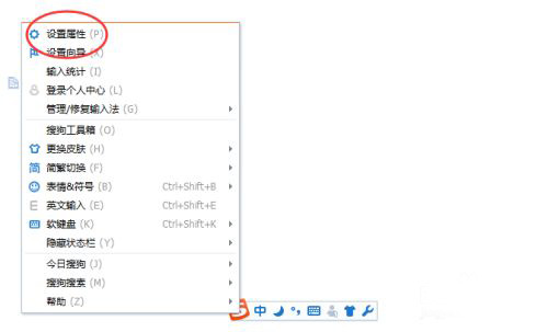2.然后右击输入法的工具栏,在下拉列表内,点击“设置属性”按钮。