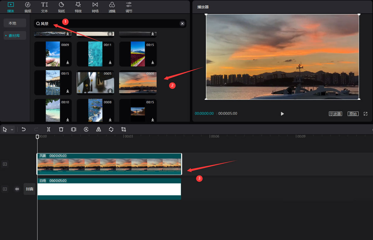 在搜索栏中输入风景两字,选择一段视频素材,将其添加到视频轨道中,并调整白场和素材时长一致。