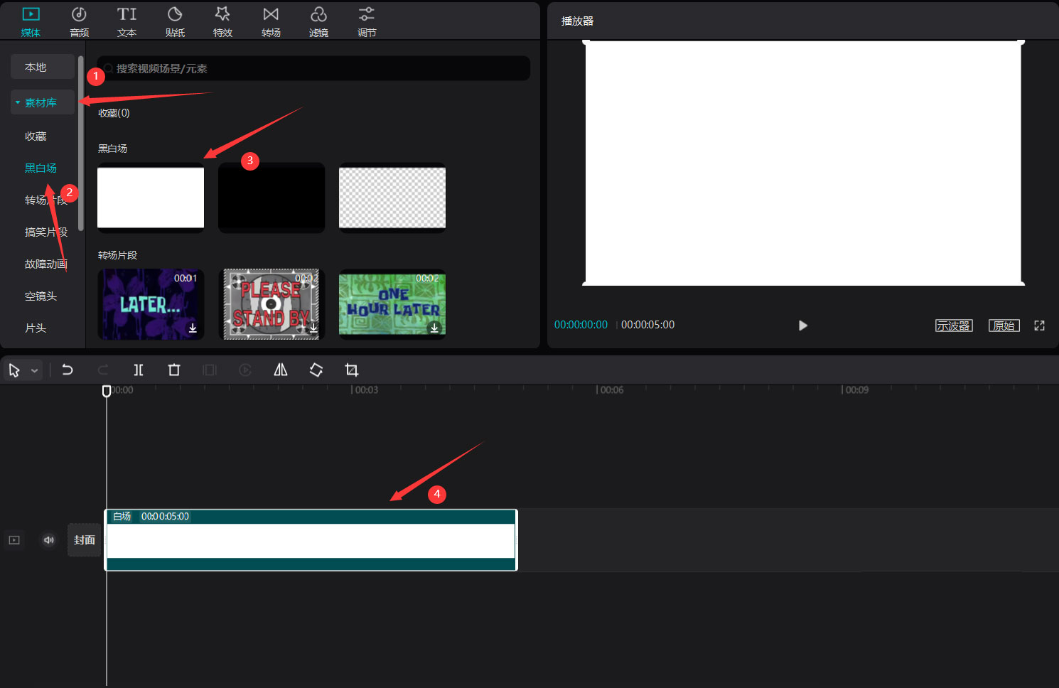 点击素材库按钮,然后点击黑白场,选择白场,将其添加到视频轨道中。