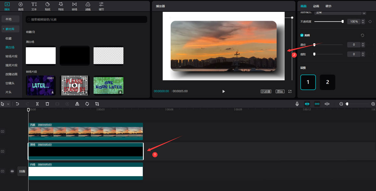 选中黑场素材,往右下方拖动,使它形成下图序号2展示的效果就可以了,最后点击播放按钮就能看到视频效果了。