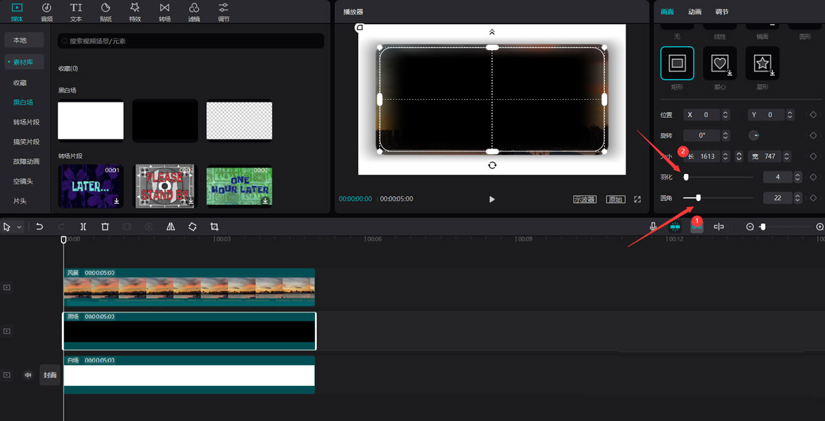 选中黑场素材,点击右侧蒙版按钮,选择矩形蒙版,调整蒙版大小贴近风景素材大小。