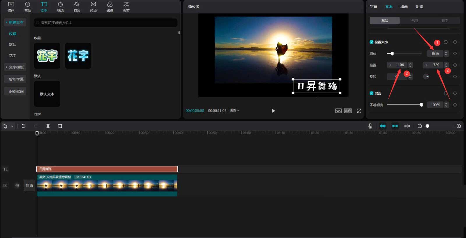 随后点击文本按钮,选择默认文本,将其添加到文本轨道中,调整文本的结尾和人物素材的结尾对齐。