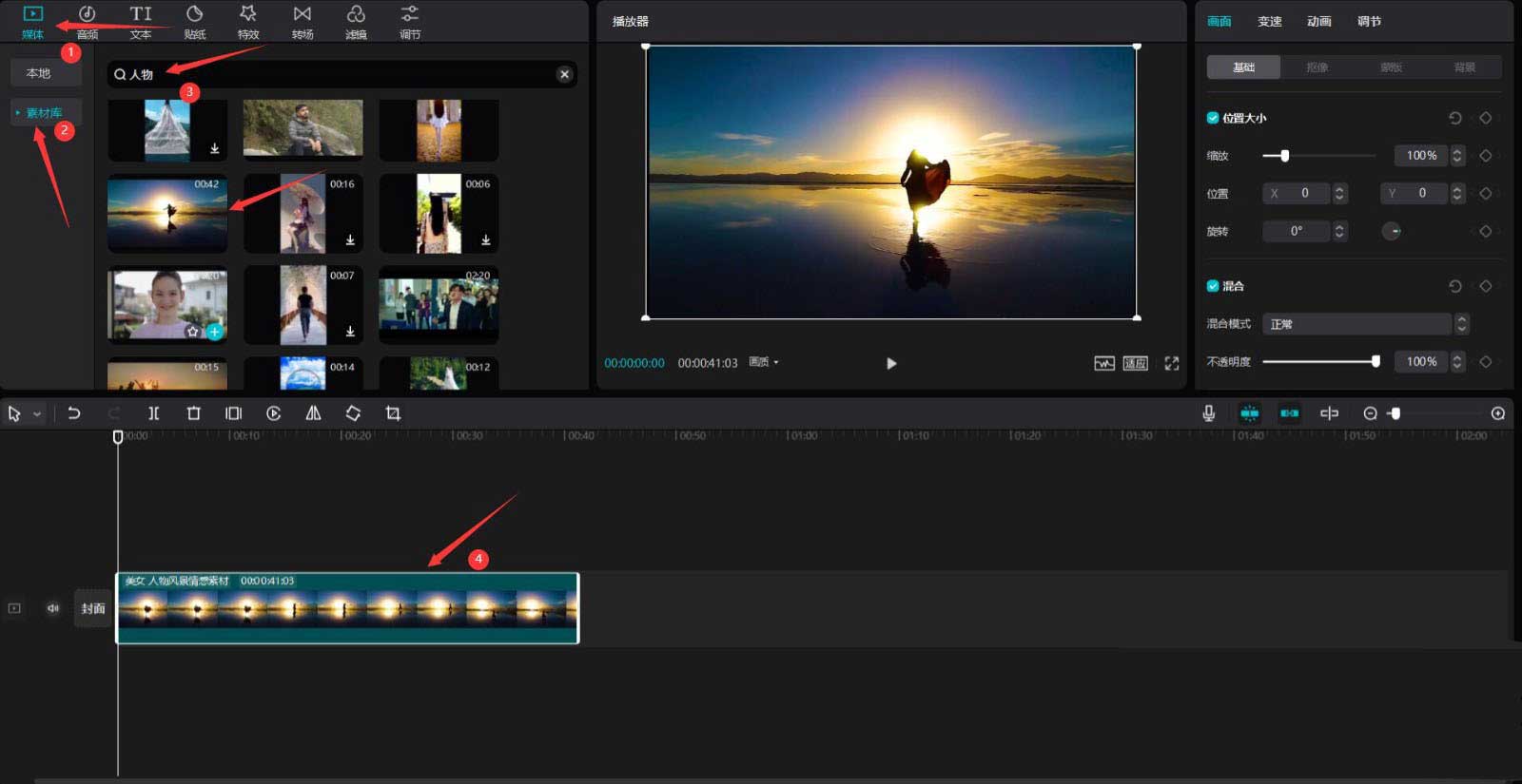 然后点击媒体按钮,点击素材库按钮,在搜索栏中输入人物两字,选择一段视频素材,将其添加到视频轨道中。