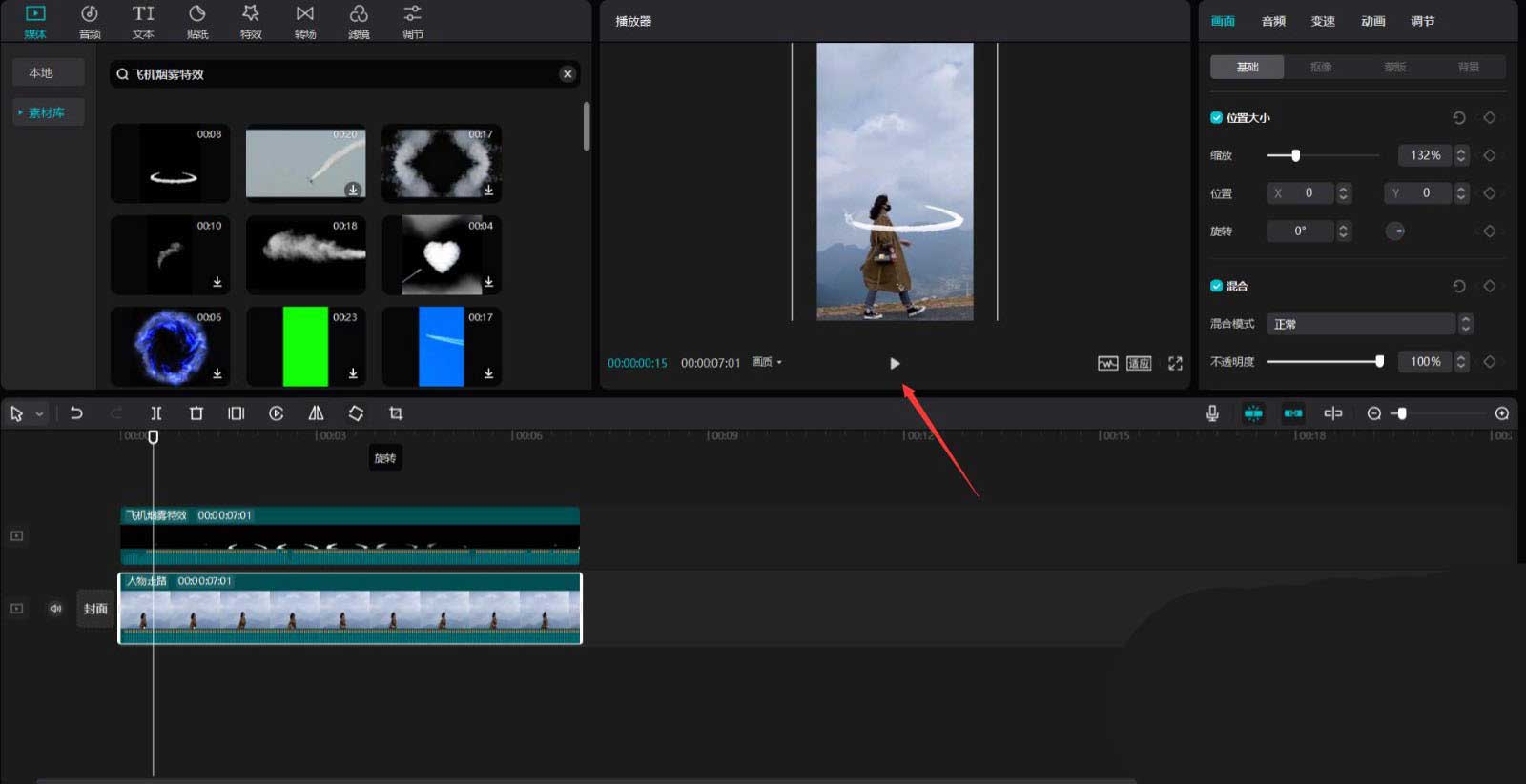 在搜索栏中输入飞机烟雾特效六个字,选择一段视频素材,将其添加到视频轨道中,见下图。