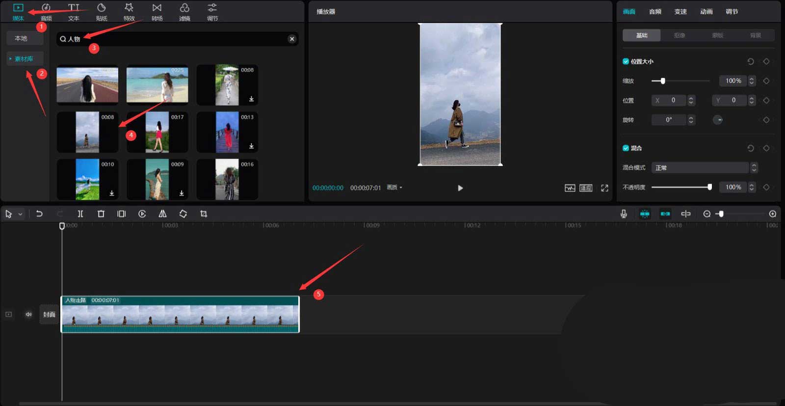 点击媒体按钮,然后点击素材库按钮,在搜索栏中输入人物两字,选择一段人物素材,将其添加到视频轨道中,见下图。