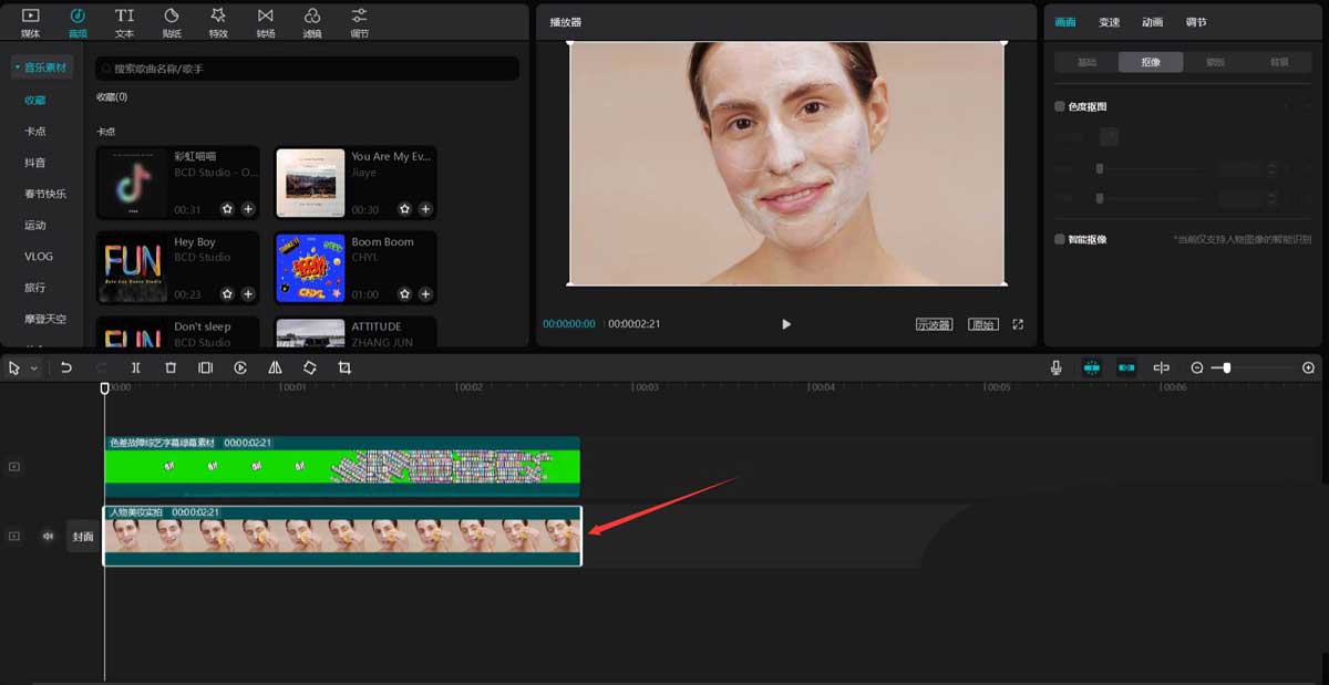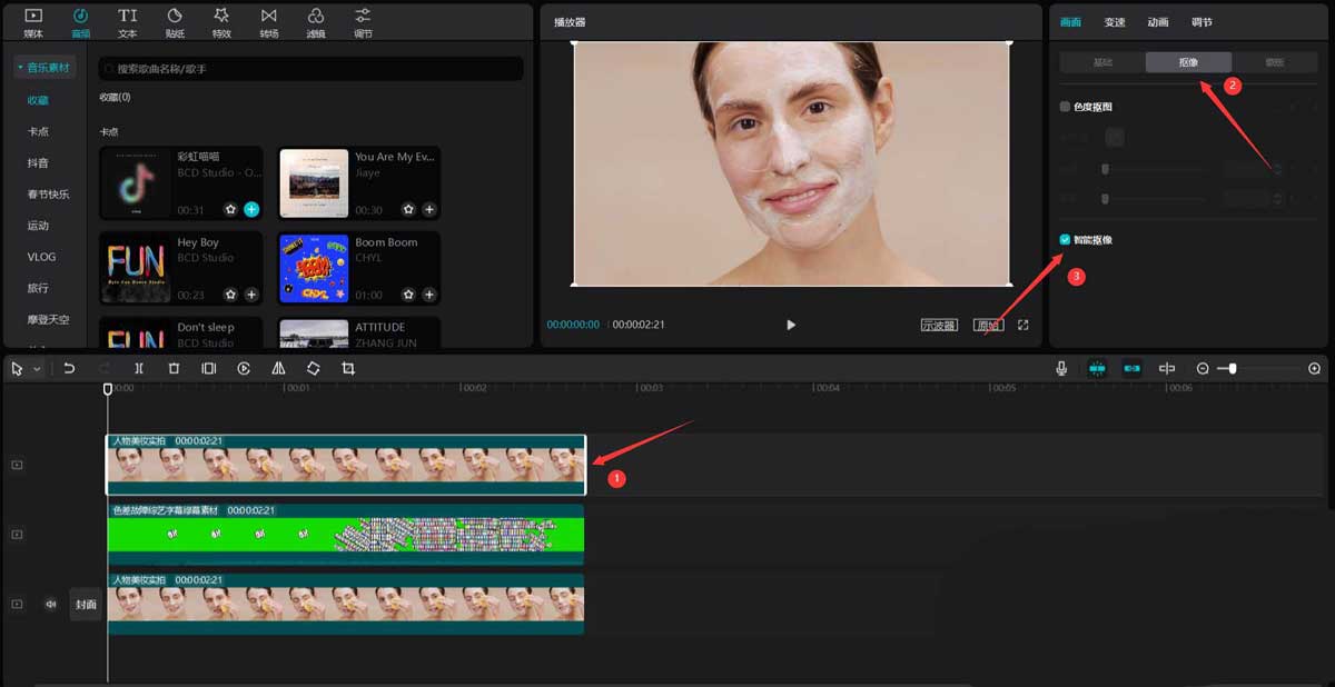 选中最上方的人物素材,点击右侧的抠像按钮,选择智能抠像,见下图。