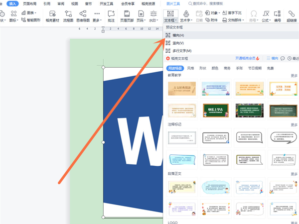 1、首先打开wps文档,插入图片后,在插入选项中点击文本框,再选择文本框方向。