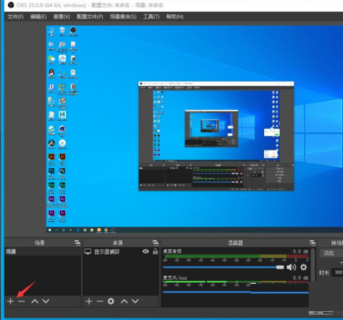 1、在OBS Studio左下角,点击箭头所指的加号。