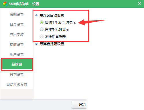 3、然后在“设置”界面的左侧打开“悬浮框”,在“悬浮框”中勾选上“启动手机助手时显示”,这样就能看到悬浮框了;