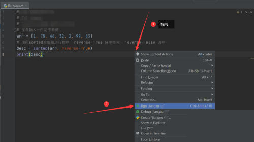 5、右击代码文件的空白处—>在弹出的选项卡中选择Run 文件选项。