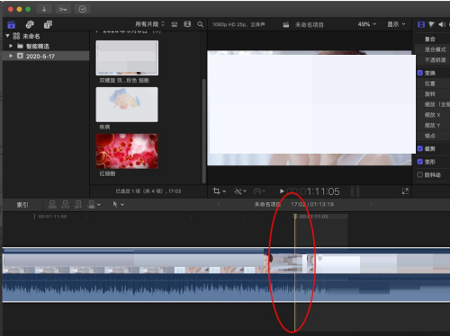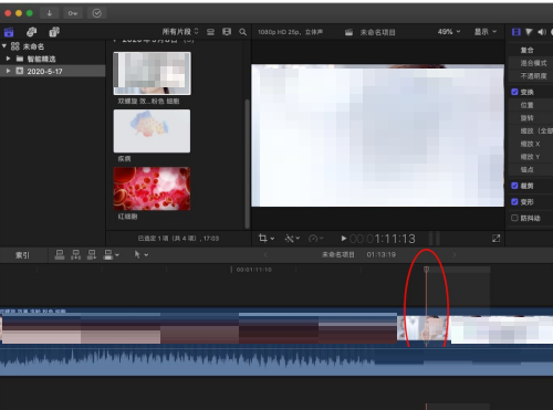 1、首先我们在视频轨道中鼠标左键点击定位到想要进行移动的时间线位置,按下键盘的command加+,可以实现对视频轨道长度的放大。
