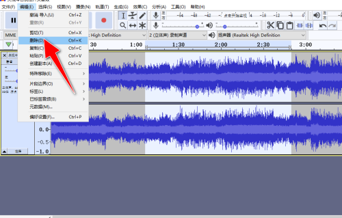 4、接着在音频编辑区中,用"鼠标左键"拖拽出一个选中的区域,被选中的区域会出现"高亮反色"显示,再选择"编辑"->"删除"菜单。